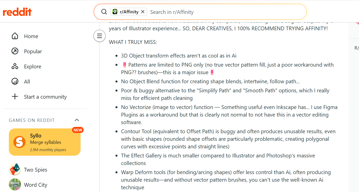 The main limitation is that Affinity Designer has fewer automation tools, plugins, and industry integrations compared to Illustrator or CorelDRAW. This may limit large commercial workflows.